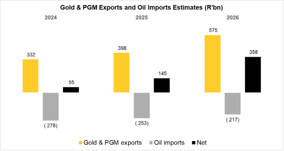 The attached graph shows that gold & PGM exports grew from R332bn to R398bn in 2025. We provide indicative numbers for 2026 based on current gold, PGM, and oil prices. The picture looks rosy for South Africa indeed!
